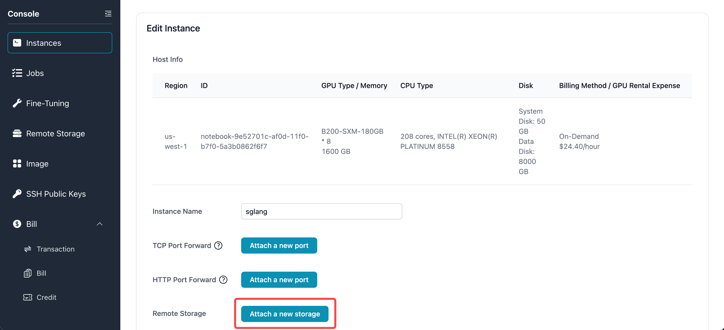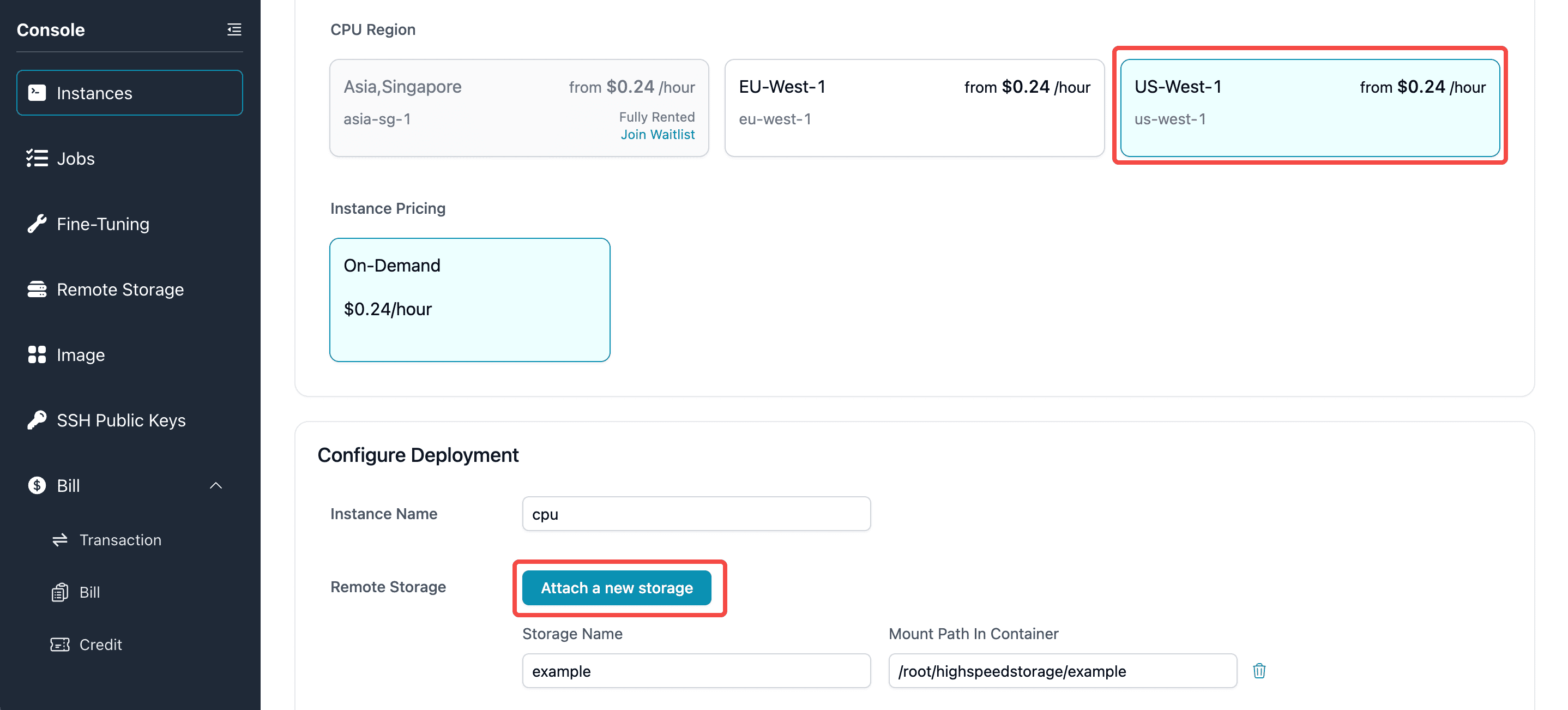 When launching a CPU instance, make sure the region is the same as the GPU instance you intend to use (for B200 users, please select US-West), then click on the button to attach a storage: