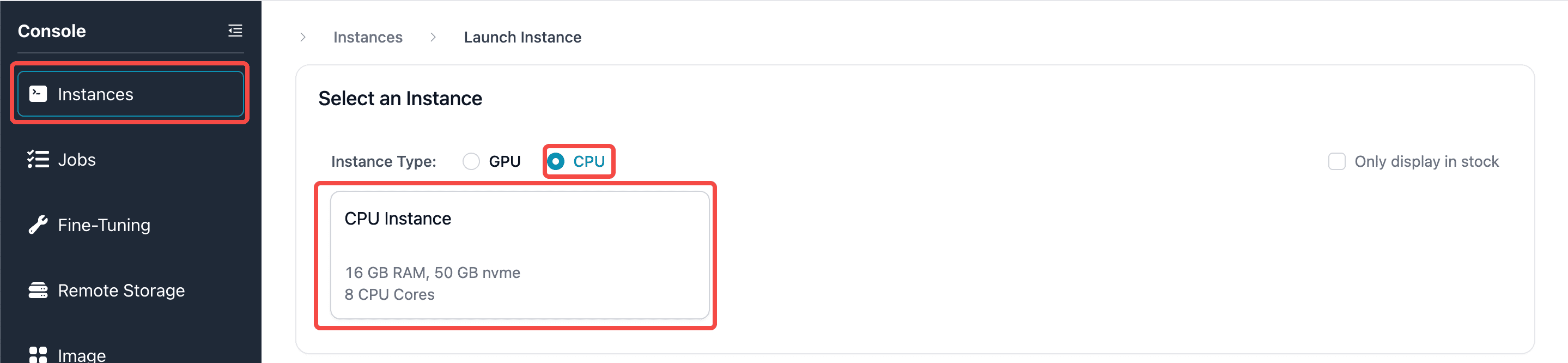 After launching the CPU instance, you can download the model weights with any tools you like.