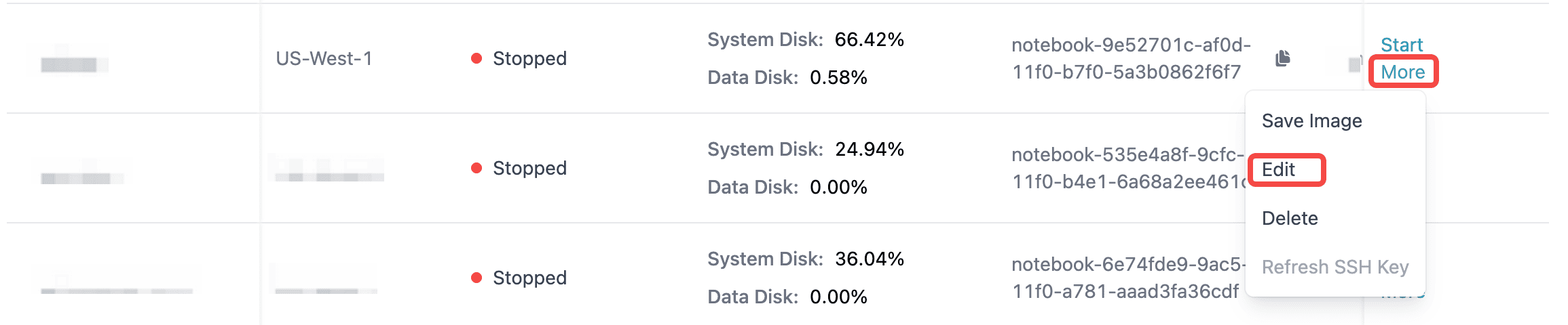 To attach a storage to your GPU instance, navigate to your note book and find the Edit button.