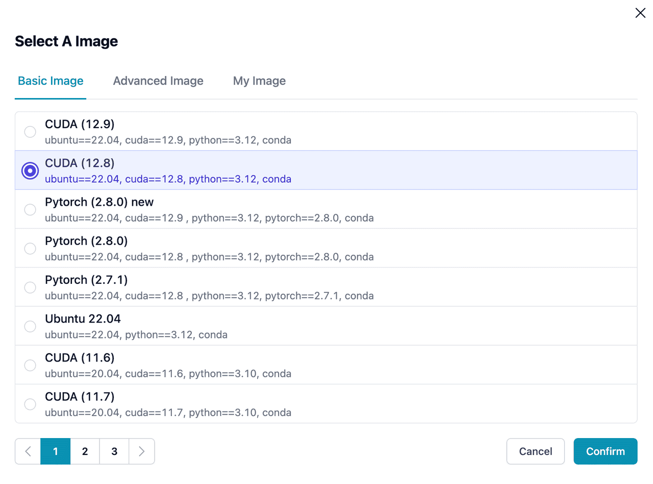 Blackwell architecture requires CUDA version >= 12.8, do make sure the software (e.g. PyTorch, vLLM, SGLang) is compiled correctly. Here we select a base image with conda pre-installed, allowing you to easily manage dependencies and environments.