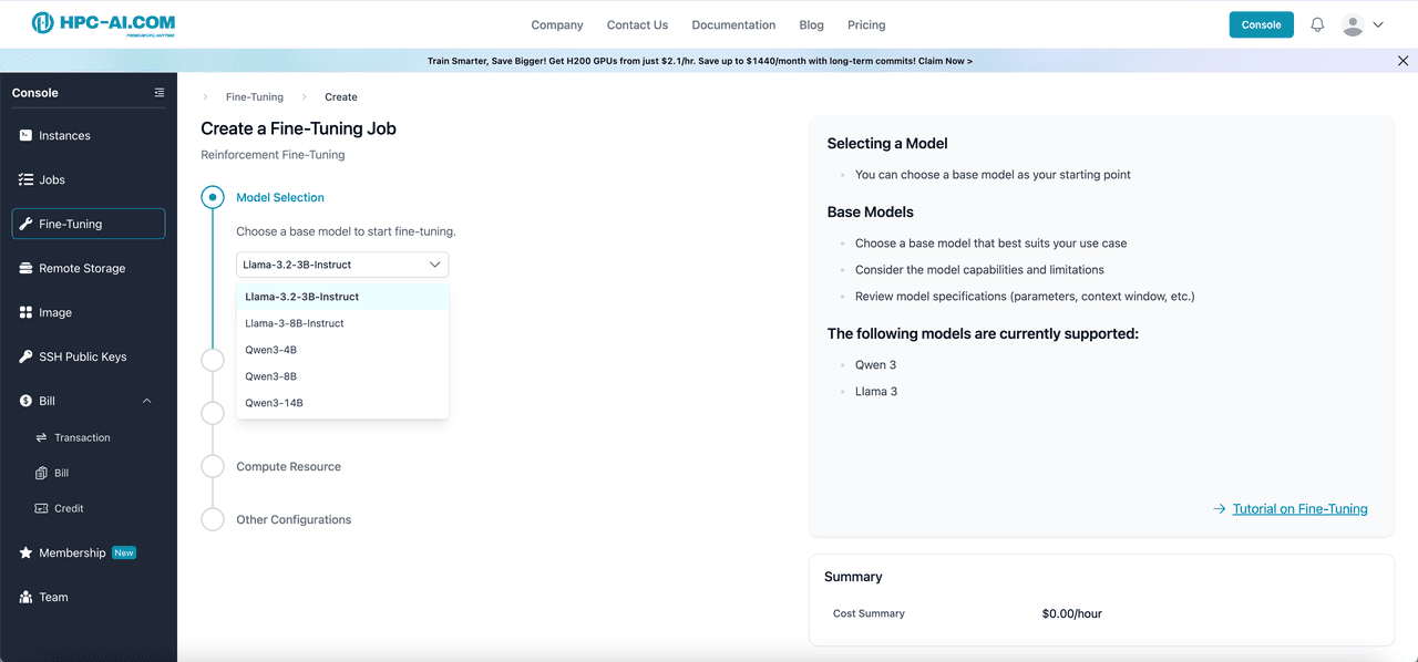 To use our Fine-Tuning function, begin by logging in to HPC-AI.COM and navigating to Fine-Tuning from the left sidebar, then select Fine-Tune a Model to start the process.