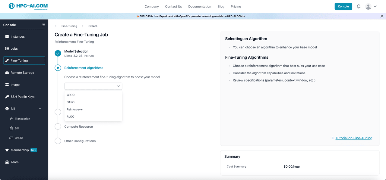 All model templates offer the flexibility to select from four reinforcement learning algorithms: GRPO, DAPO, Reinforce++ (baseline), and RLOO for reinforcement fine-tuning. If you require additional templates or algorithms beyond these options, please reach out to our team at service@hpc-ai.com.