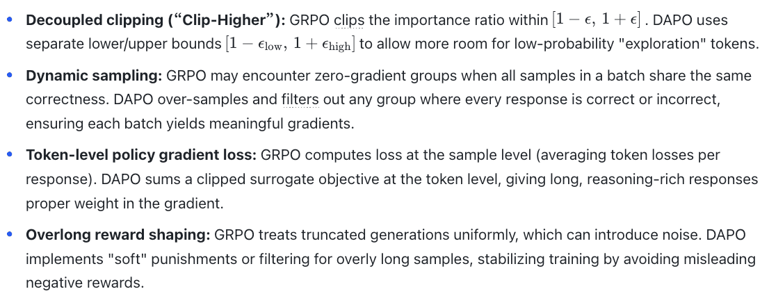 DAPO extends GRPO by decoupling the lower/upper clipping bounds and adding a dynamicāsampling step to avoid zeroāgradient groups. While GRPO estimates advantages by normalizing groupālevel rewards and applies a symmetric clip plus optional KL penalty, DAPO introduces four major innovations to address GRPOās instability and inefficiencies: