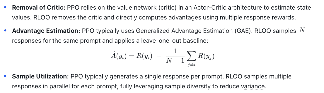 RLOO is a criticāfree approach to reinforcement fineātuning. Its main idea is to remove the critic model used in PPO, thereby saving a substantial amount of GPU memory. Without a critic, RLOO estimates advantages by sampling $N$ responses for each prompt and applying a leaveāoneāout baseline, subtracting the average reward of the other $N-1$ samples from each responseās own reward.