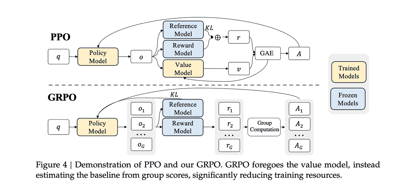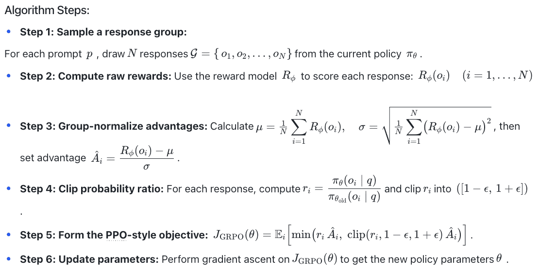 GRPO differs from PPO only in how it computes the advantage $\hat A_t $. Instead of using a learned value function and GAE, it samples a small group of$N$outputs for each prompt and normalizes their rewards.