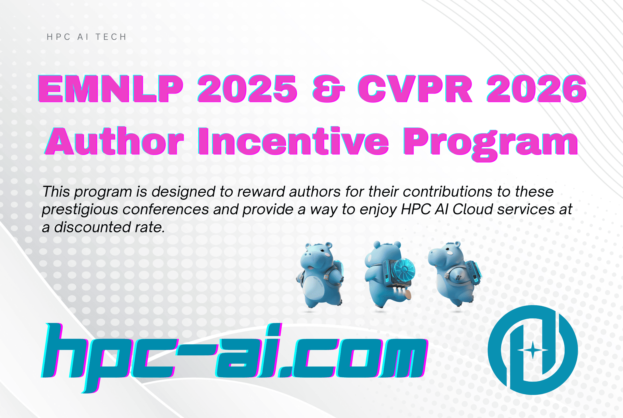 HPC-AI.COM is excited to offer an exclusive Author Incentive Program for participants of EMNLP 2025 and CVPR 2026. This program is designed to reward authors for their contributions to these prestigious conferences and provide a way to enjoy HPC AI Cloud services at a discounted rate.