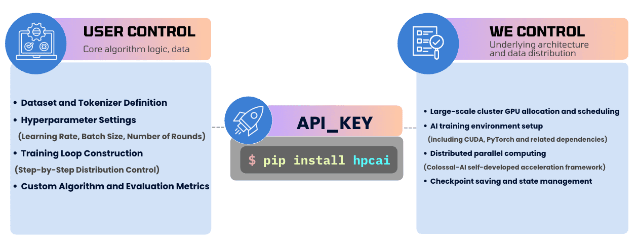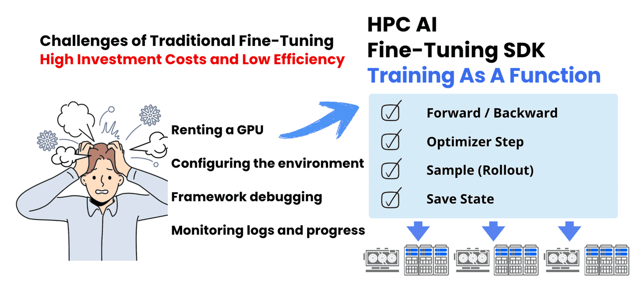 The core philosophy of HPC-AI.COM’s Fine-Tuning SDK is simple: you define the algorithm logic; we handle the infrastructure.