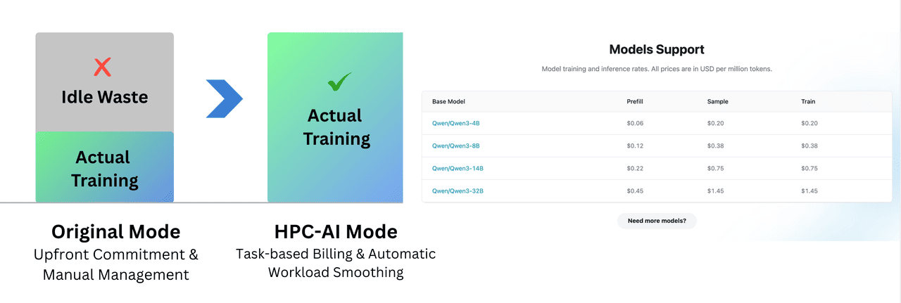 HPC-AI.COM transforms this with Serverless architecture for fine-tuning, pioneering a "token-based pricing" model that splits compute services into the finest granularity: