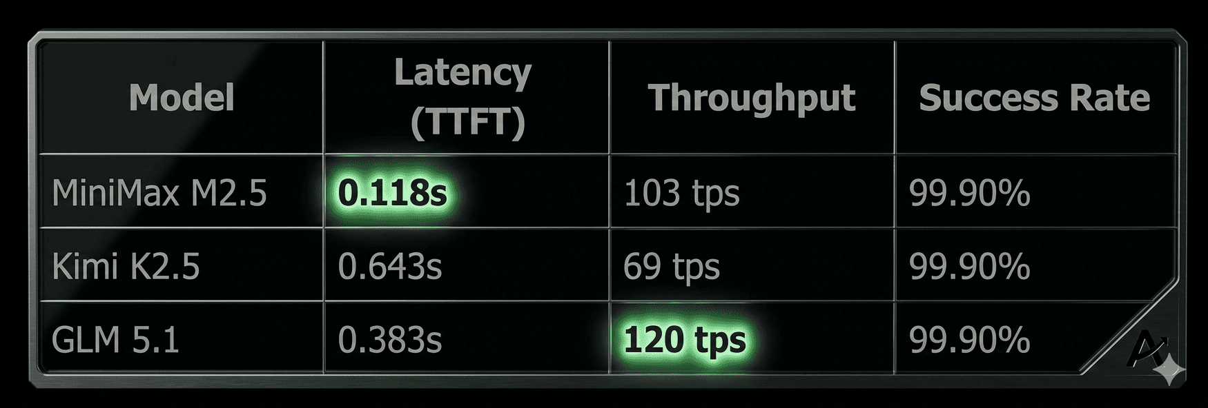 GLM 5.1 leads in this category with 120 tokens per second, followed closely by MiniMax M2.5 at 103 tps. This determines how quickly a model can generate content once a response has started.